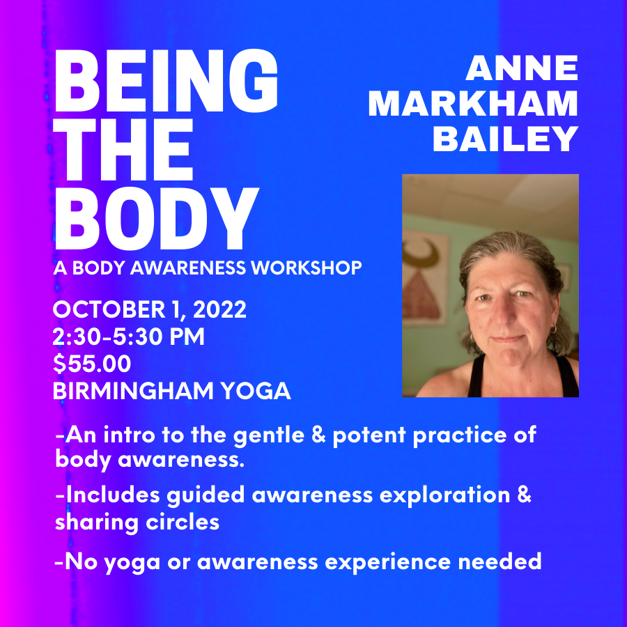 Being the Body Workshop You can learn to move into the power of being a body, as you are right now. Register